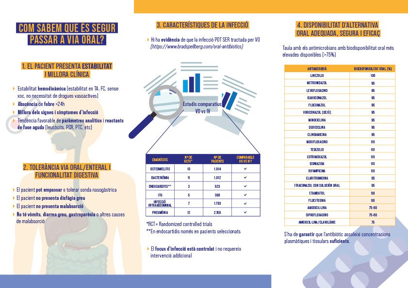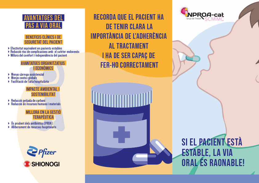 Els equips PROA s’han adherit també a la campanya impulsada per la Societat Catalana de Malalties Infeccioses i Microbiologia Clínica, que aquest any es difon sota el lema “Si el pacient està estable, la via oral és raonable”. L’objectiu és posar en valor els beneficis de l’administració oral dels antimicrobians en molts pacients hospitalitzats per mirar de reduir complicacions associades a la via intravenosa, disminuir la càrrega assistencial d’infermeria i els costos, i també reduir la petjada ecològica. Tal i com explica la Dra. Susanna Melendo, adjunta de la Unitat de Patologia Infecciosa i Immunodeficiències Pediàtriques, "la recerca en els darrers anys ens ha ajudat a confirmar que alguns fàrmacs administrats per via oral són igual de segurs que per via intravenosa, la qual cosa ens permet simplificar els tractaments, enviar el pacient a casa i reduir riscos".